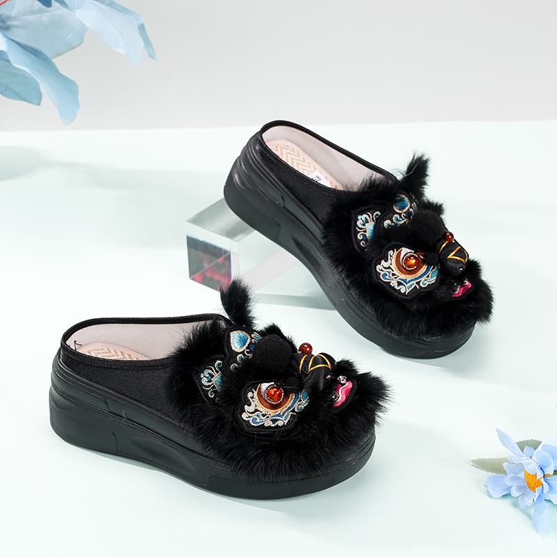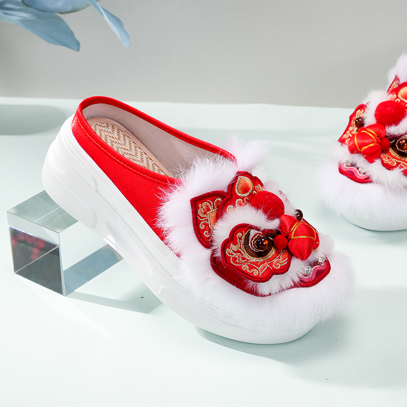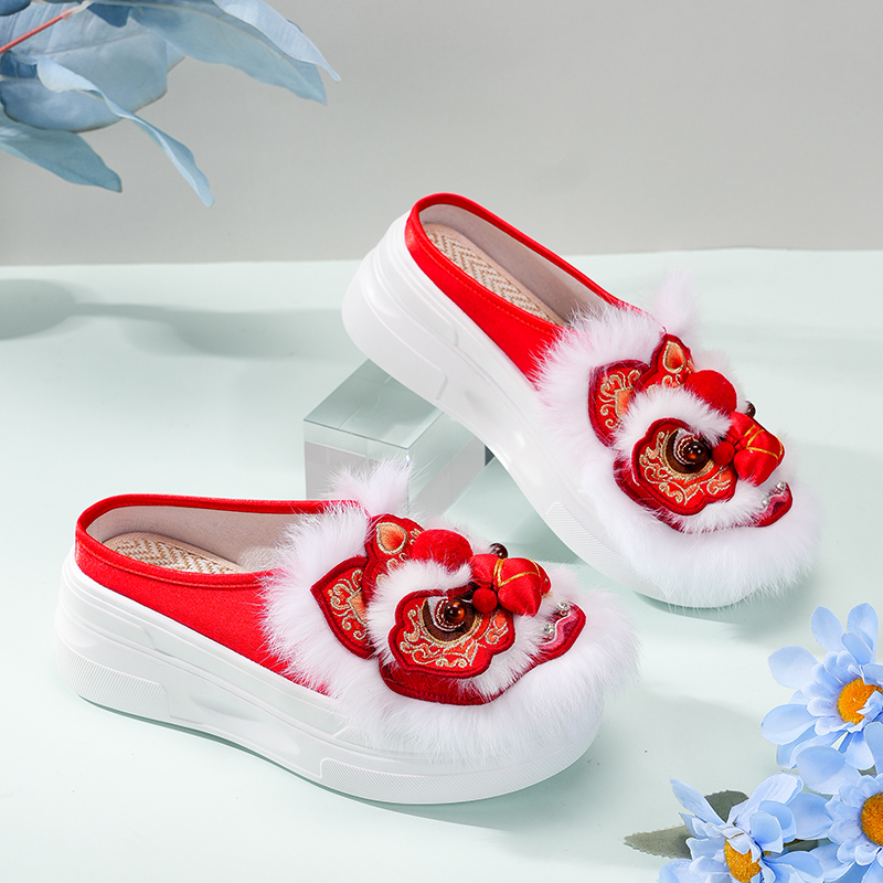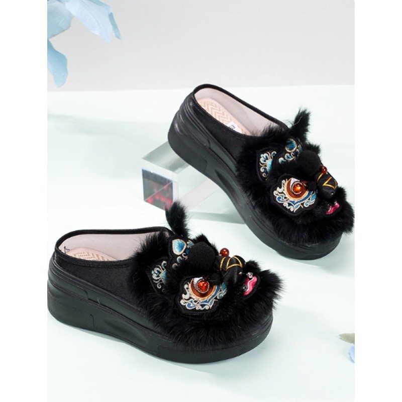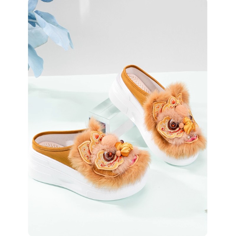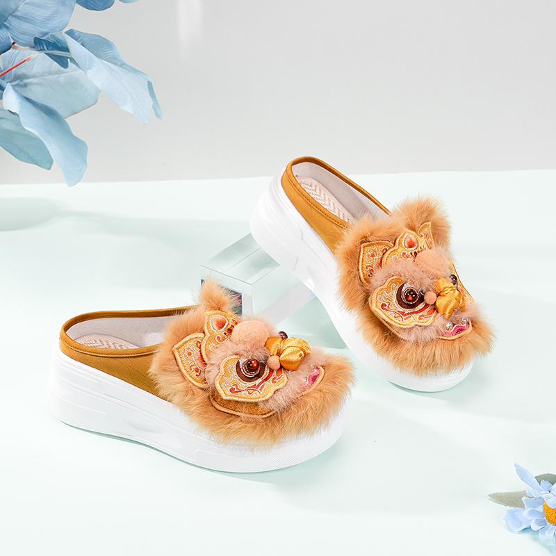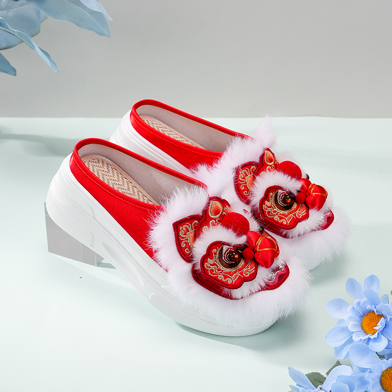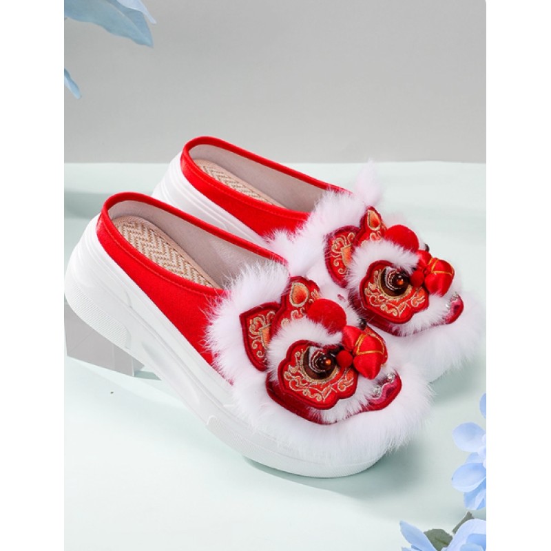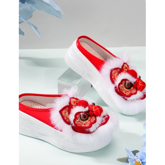Bring tradition and style together with our Handmade Lion Dance Closed-Toe Platform Mules. Inspired by the iconic Chinese lion dance, these shoes feature exquisite hand embroidery and vibrant colors, making them a true statement piece.