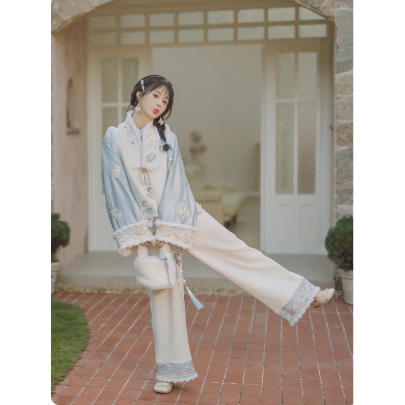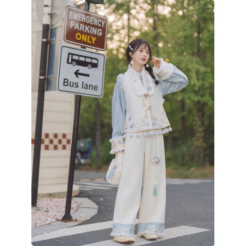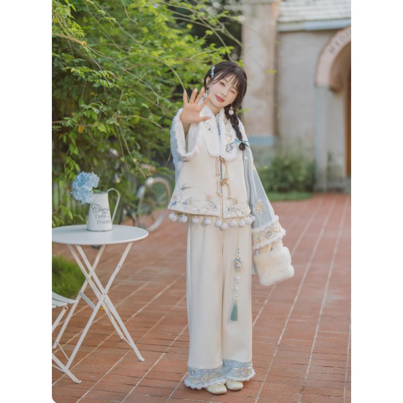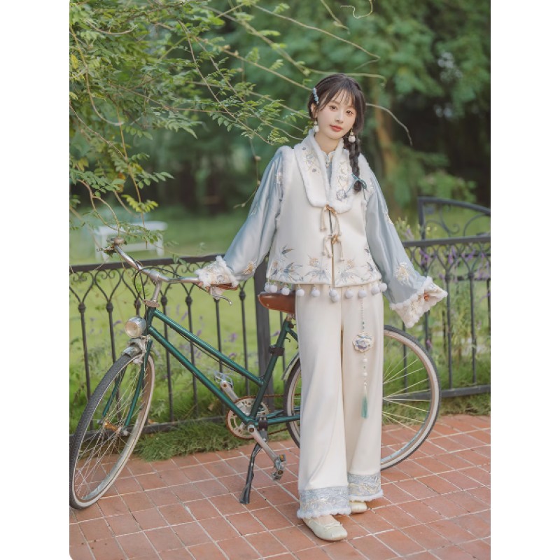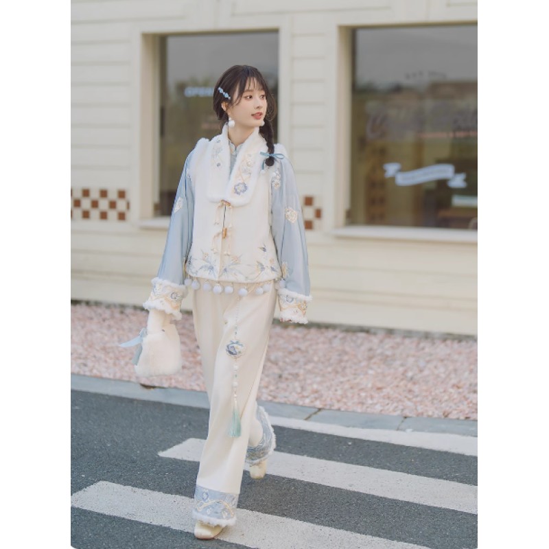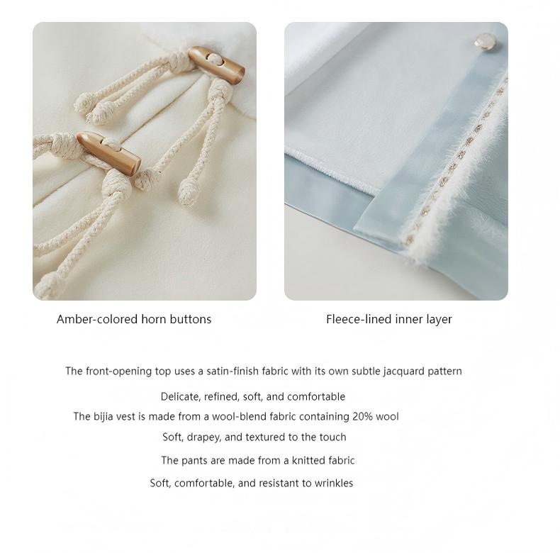 This Chinese Hanfu set perfectly blends traditional elements with modern design, specially crafted for women who seek comfort and elegance. The set includes a bijia vest, a stand-collar top, and straight-leg long pants, made from thickened material for warmth and comfort, ideal for autumn and winter wear.