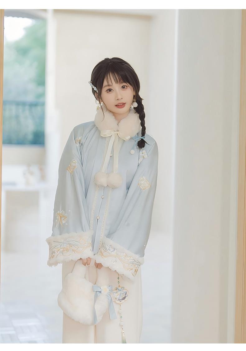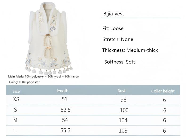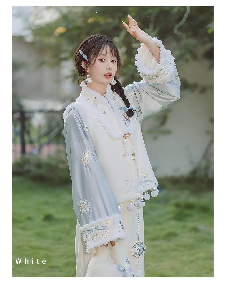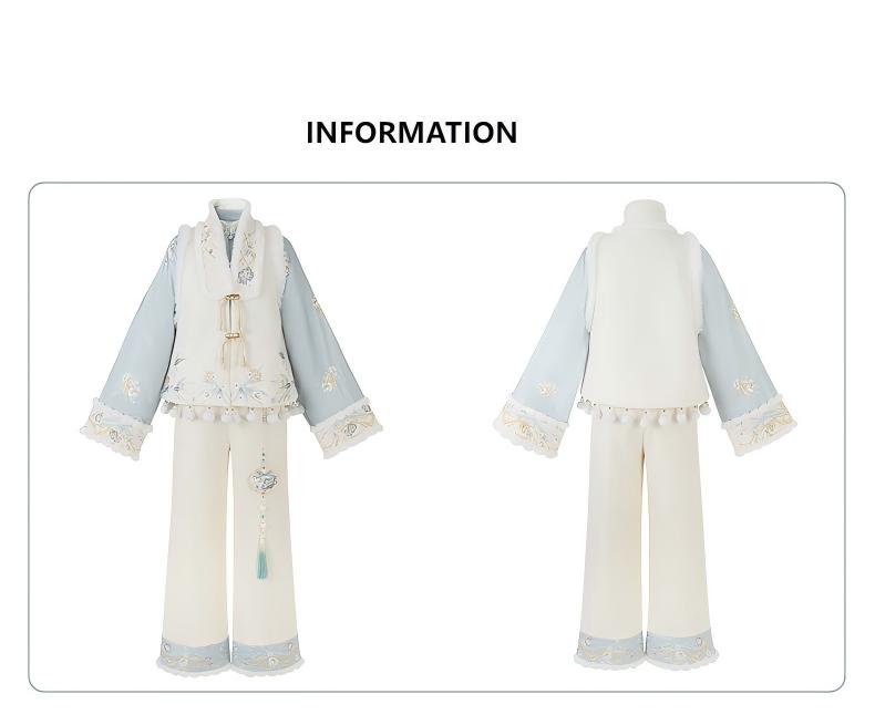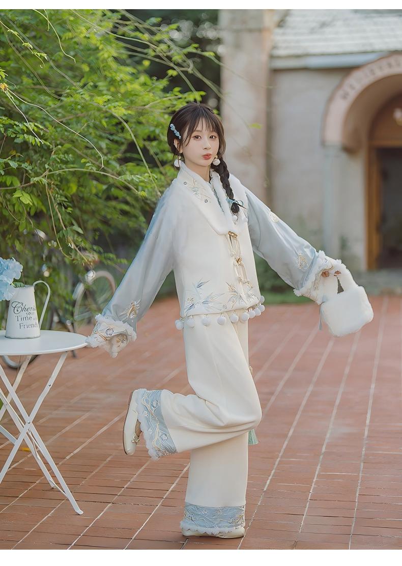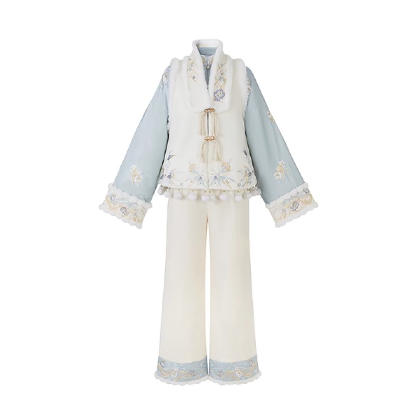This Chinese Hanfu set perfectly blends traditional elements with modern design, specially crafted for women who seek comfort and elegance. The set includes a bijia vest, a stand-collar top, and straight-leg long pants, made from thickened material for warmth and comfort, ideal for autumn and winter wear.