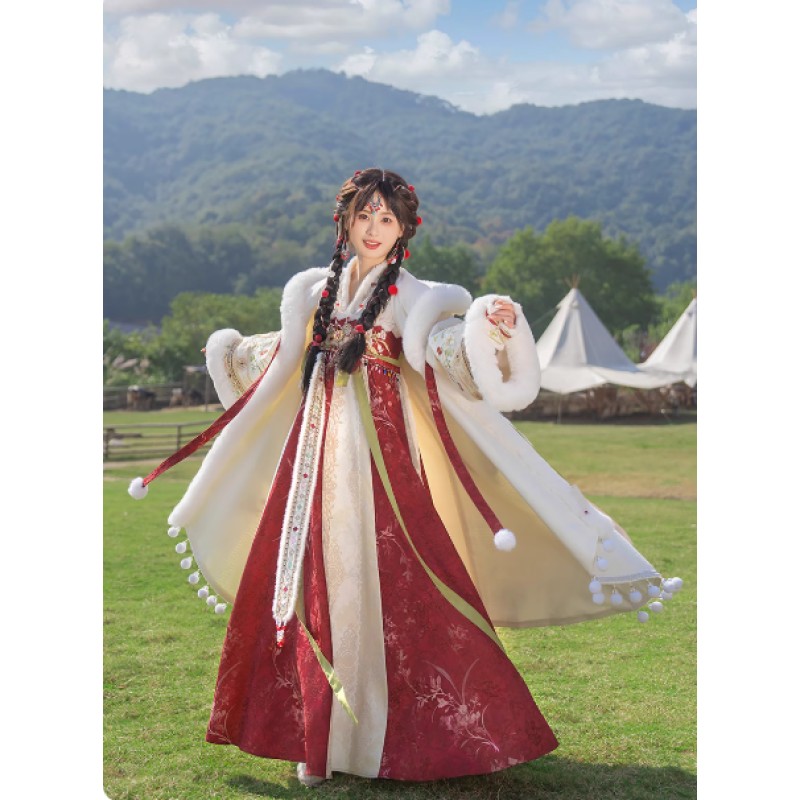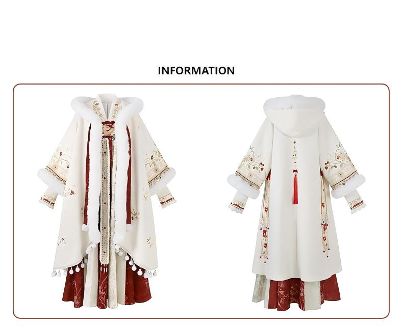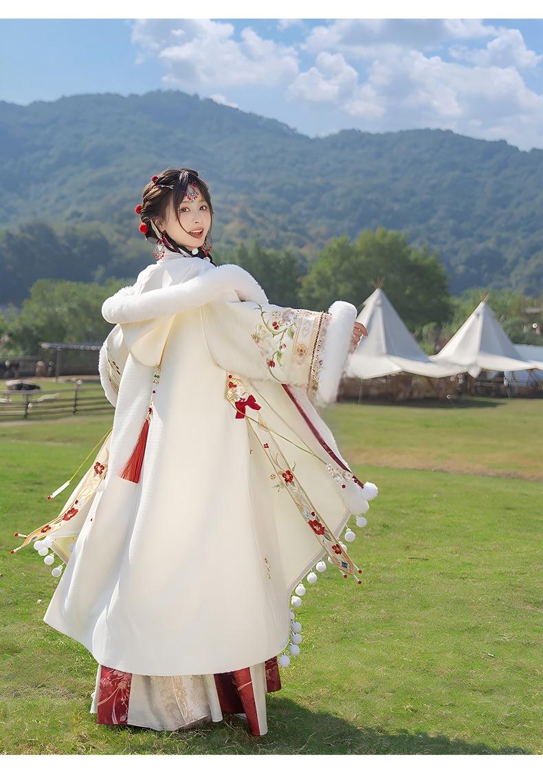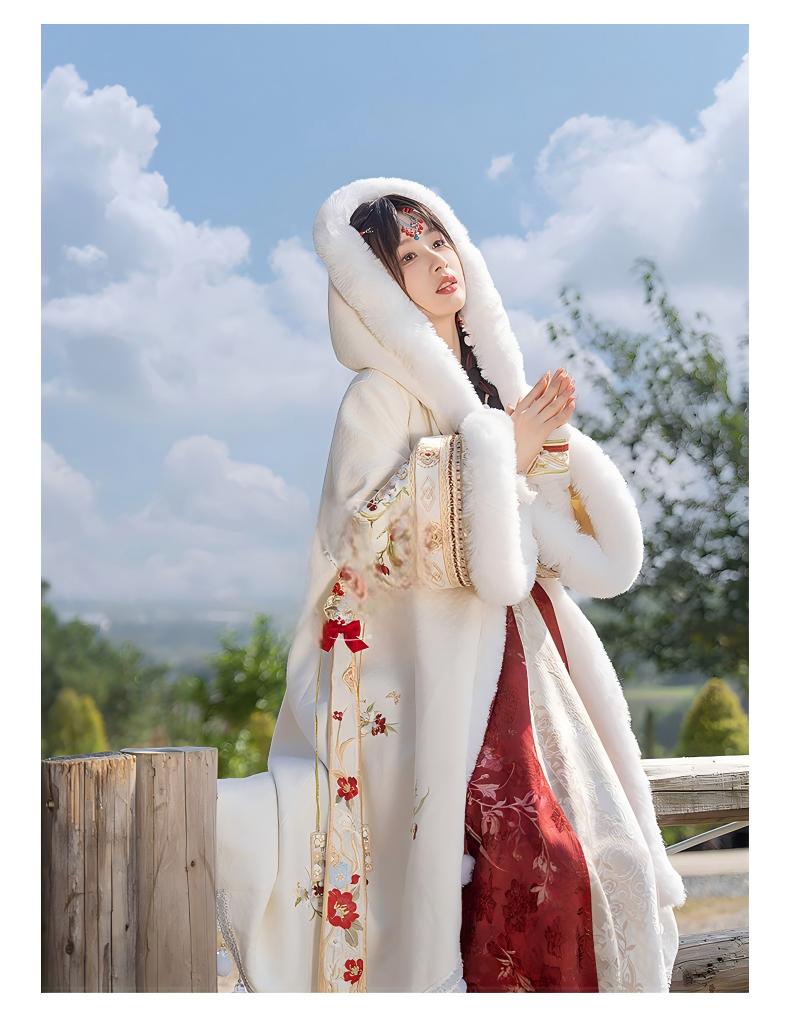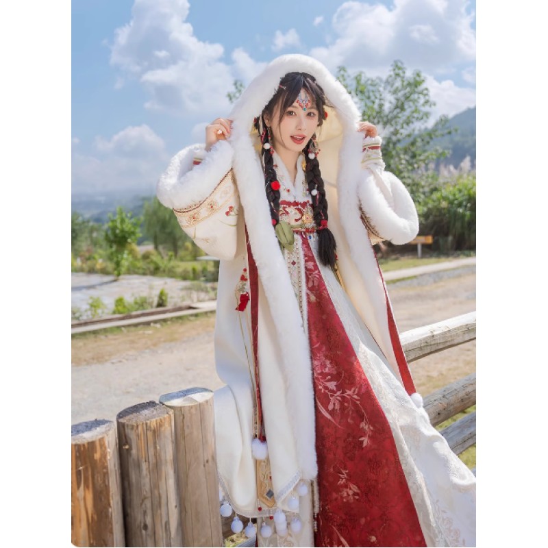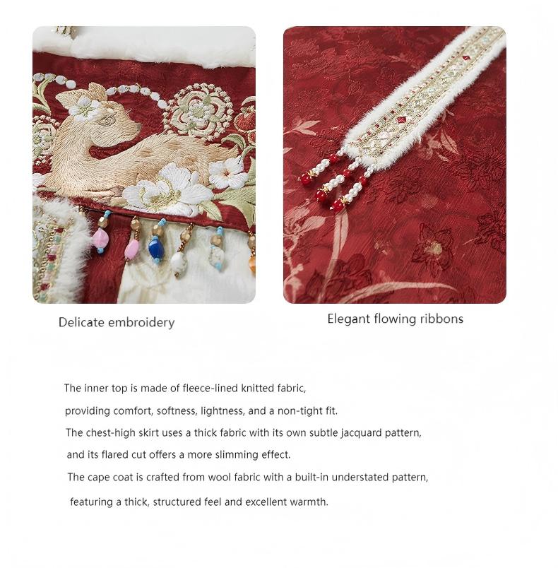 Embrace the elegance of classic Chinese style with this modernized chest-high Hanfu set, designed for comfort, warmth, and style during autumn and winter. This set includes three pieces: a warm cape coat and a two-piece chest-high outfit, combining traditional charm with contemporary wearability.