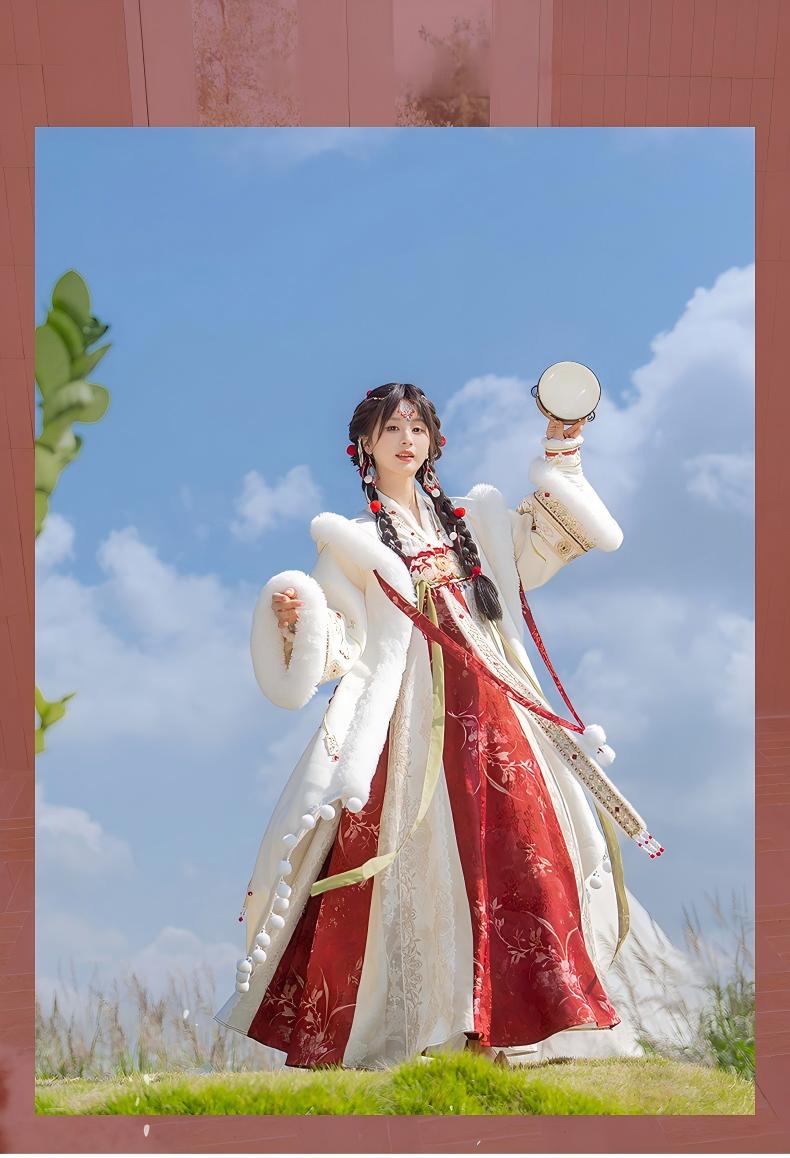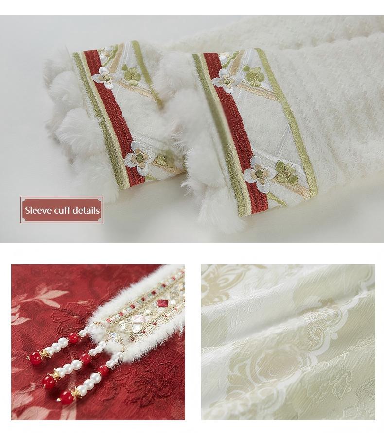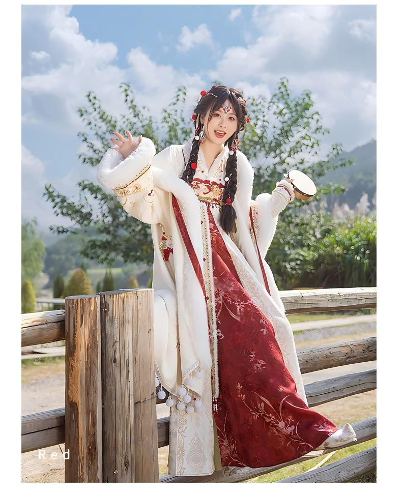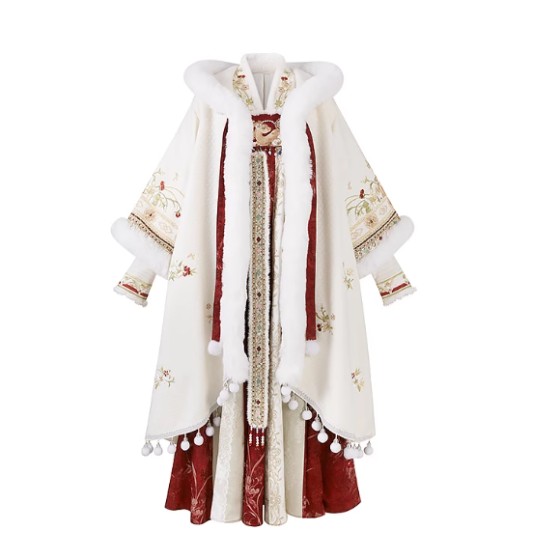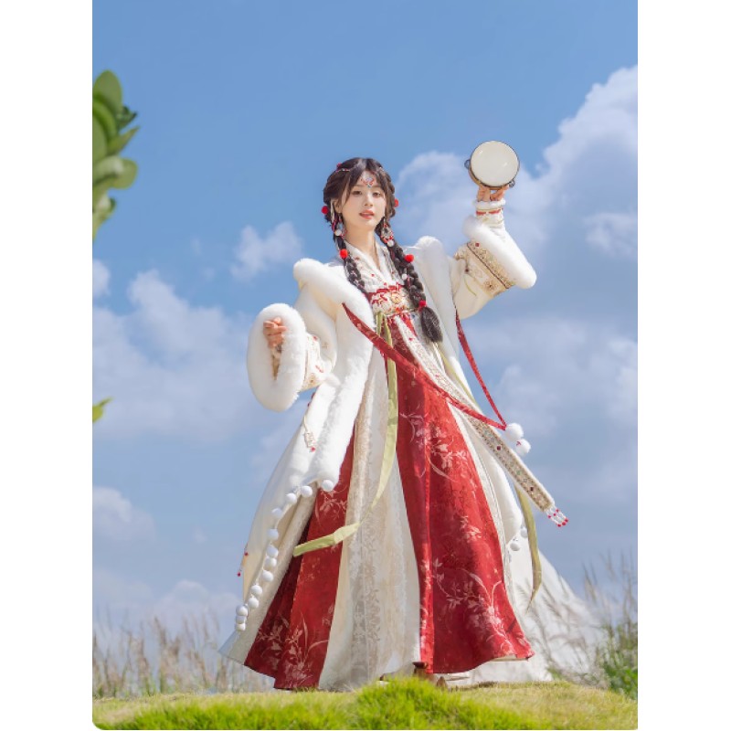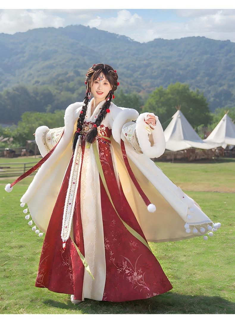 Embrace the elegance of classic Chinese style with this modernized chest-high Hanfu set, designed for comfort, warmth, and style during autumn and winter. This set includes three pieces: a warm cape coat and a two-piece chest-high outfit, combining traditional charm with contemporary wearability.