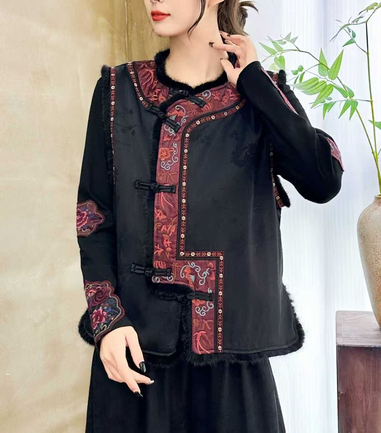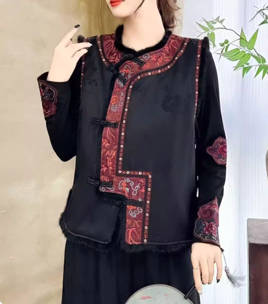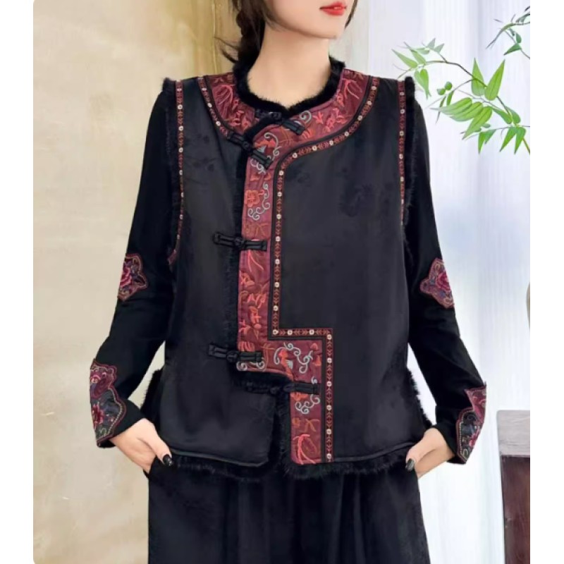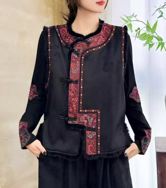 Embrace traditional Chinese elegance with this women’s embroidered vest, featuring exquisite heavy embroidery inspired by classical motifs. Crafted from high-quality artificial silk, this vest showcases intricate floral and plant patterns, giving it a refined and luxurious texture.