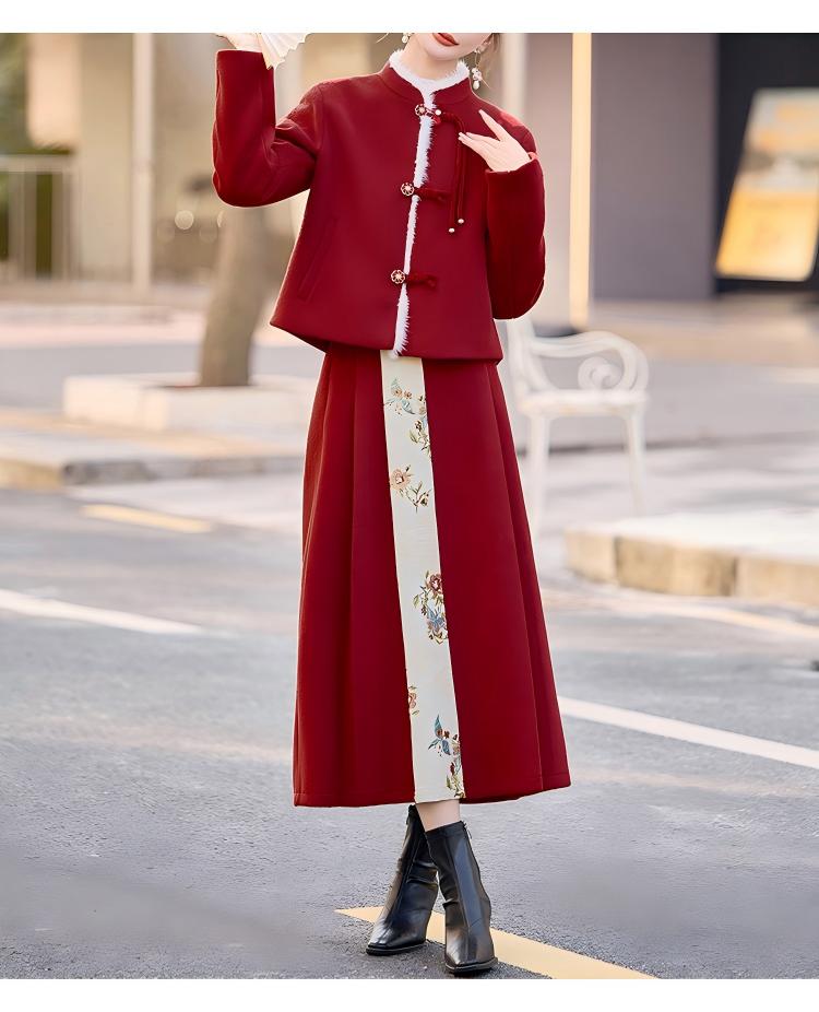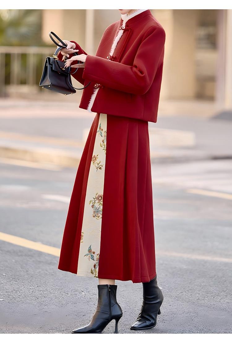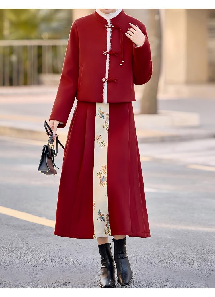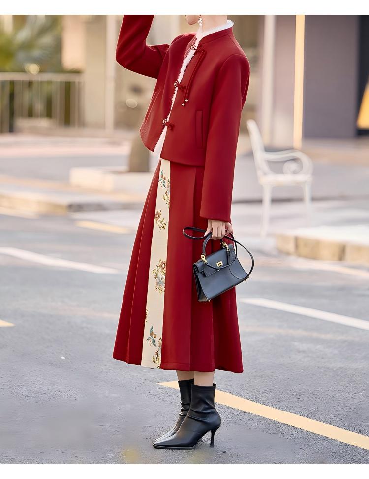 Embrace the elegance of traditional Chinese fashion with this beautifully crafted women’s mid-length red down coat and matching half skirt set. Designed with exquisite frog-button (pankou) detailing, this outfit blends cultural charm with modern comfort, making it a standout choice for winter.