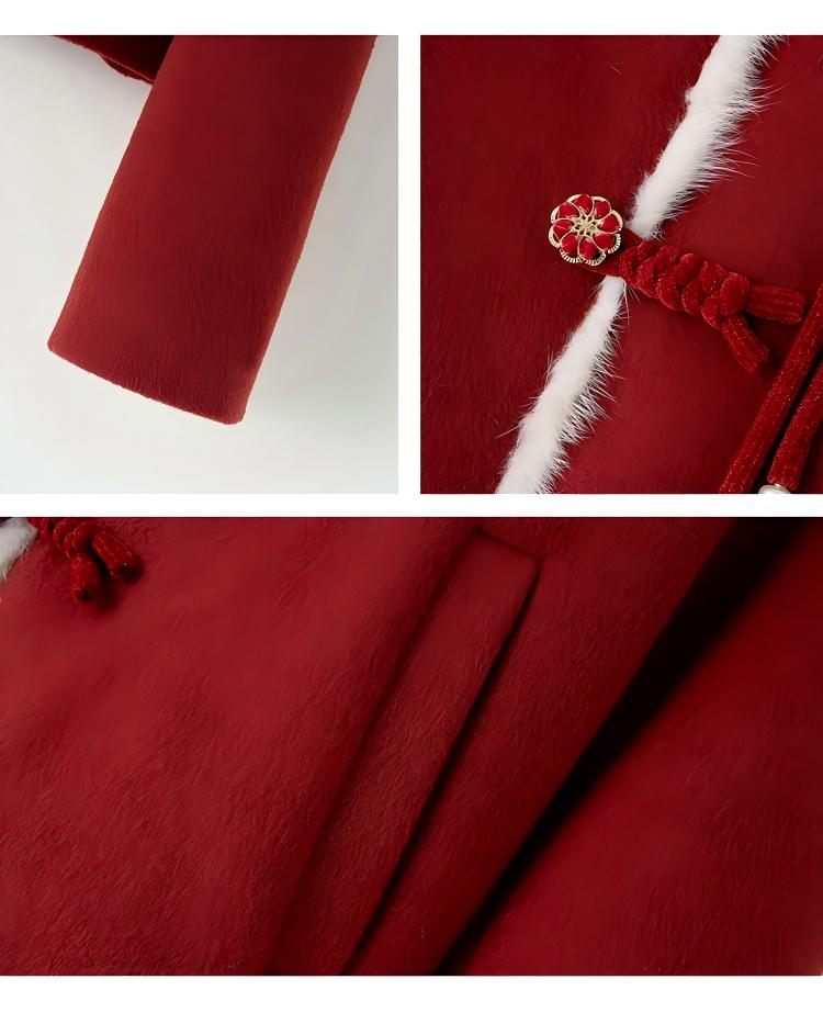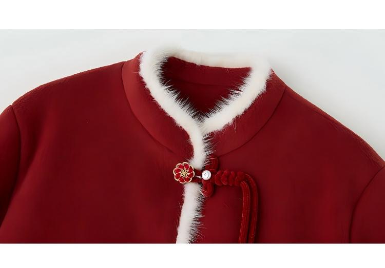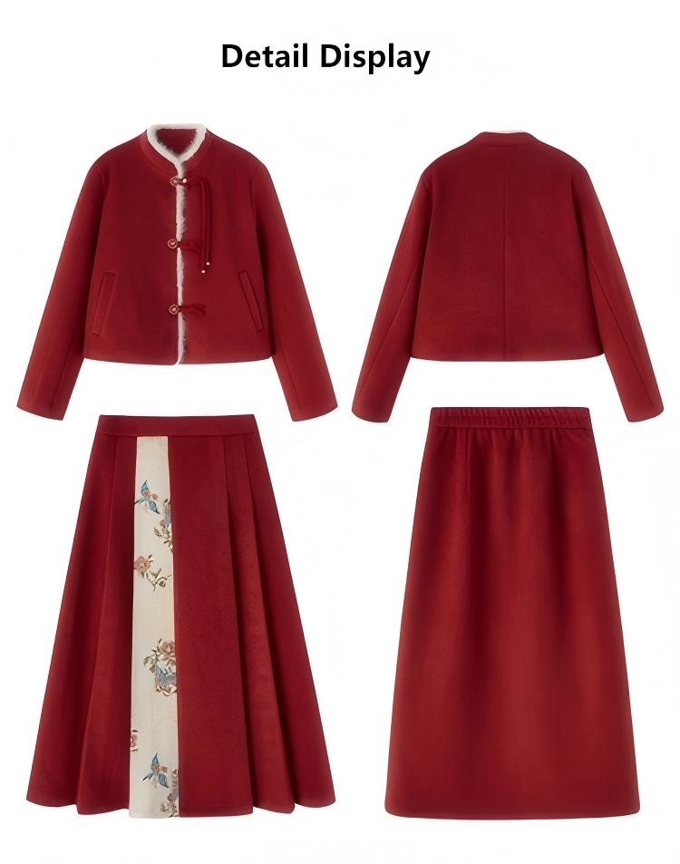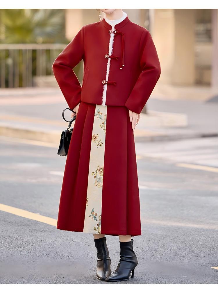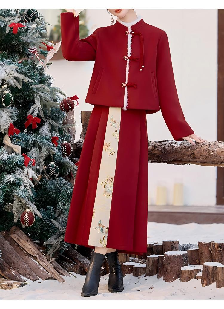 Embrace the elegance of traditional Chinese fashion with this beautifully crafted women’s mid-length red down coat and matching half skirt set. Designed with exquisite frog-button (pankou) detailing, this outfit blends cultural charm with modern comfort, making it a standout choice for winter.