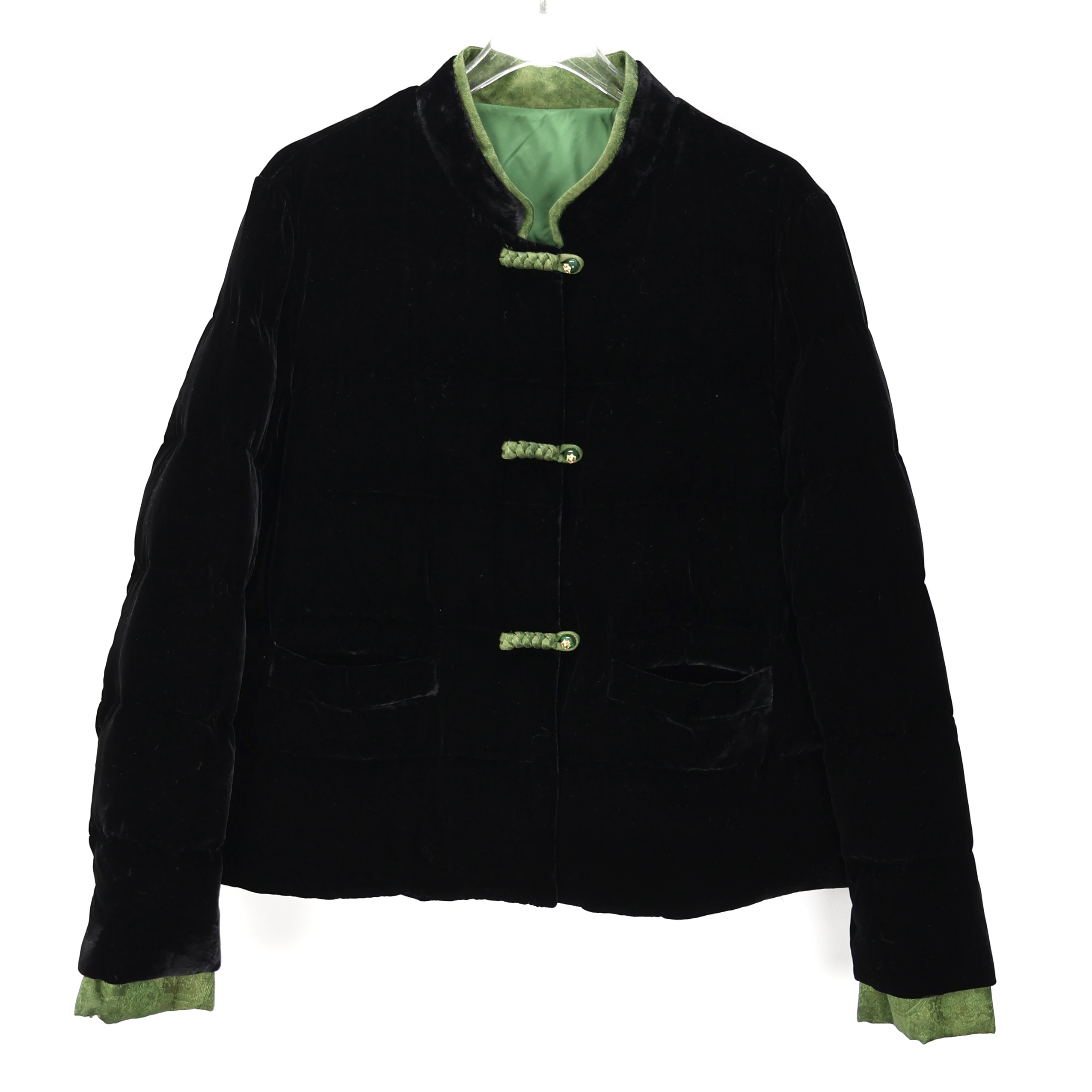 Details: Color-block panels, frog button closures, non-hooded design for an elegant look