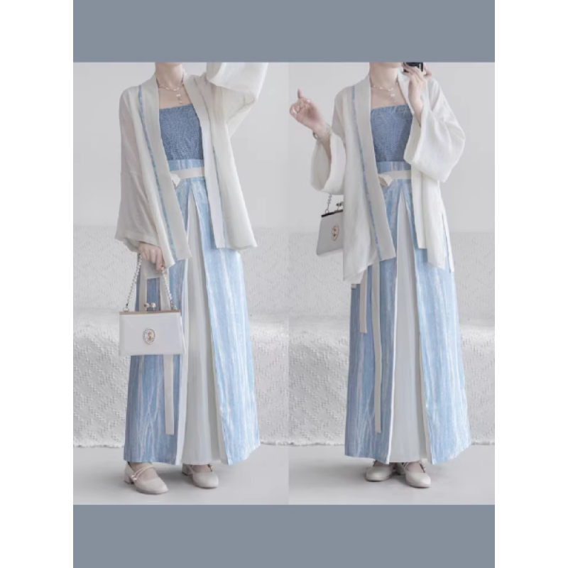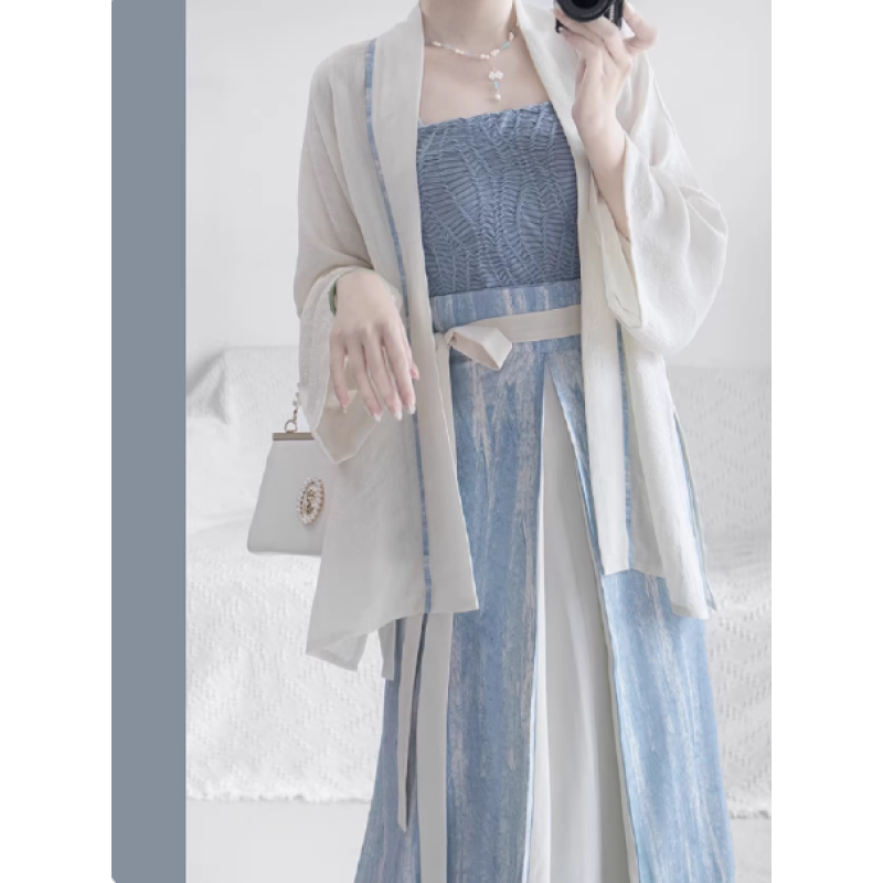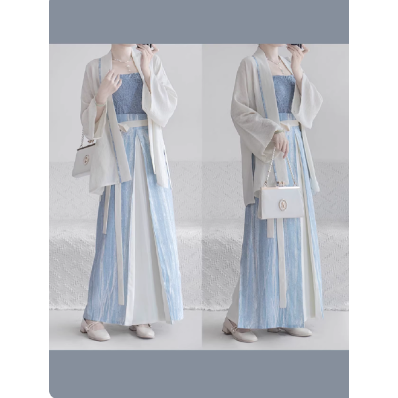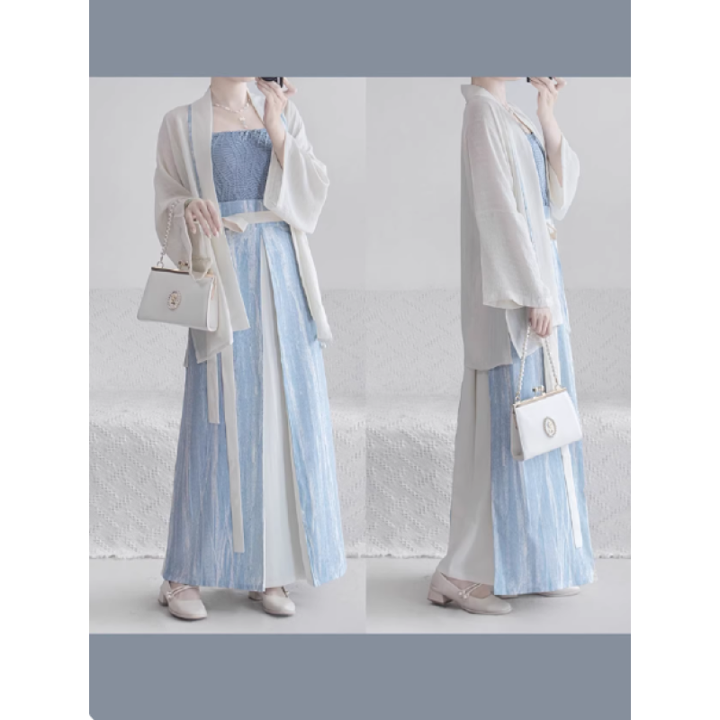 This Song-Style Modern Chinese Casual 3-Piece Set features a cross-collar top, a spaghetti-strap camisole, and a three-panel skirt, perfectly blending traditional Chinese elements with modern design.