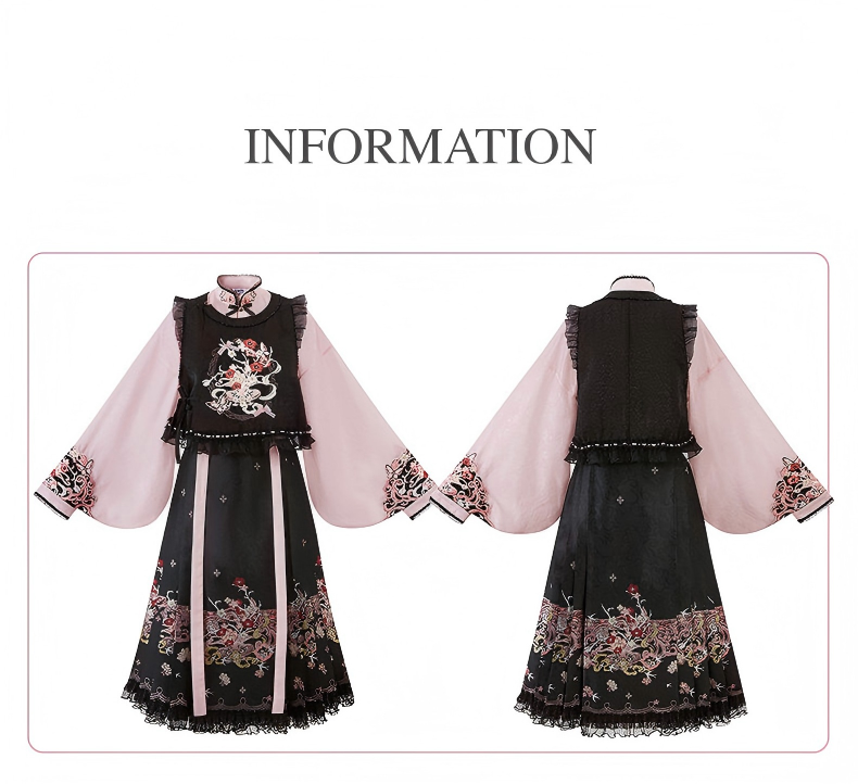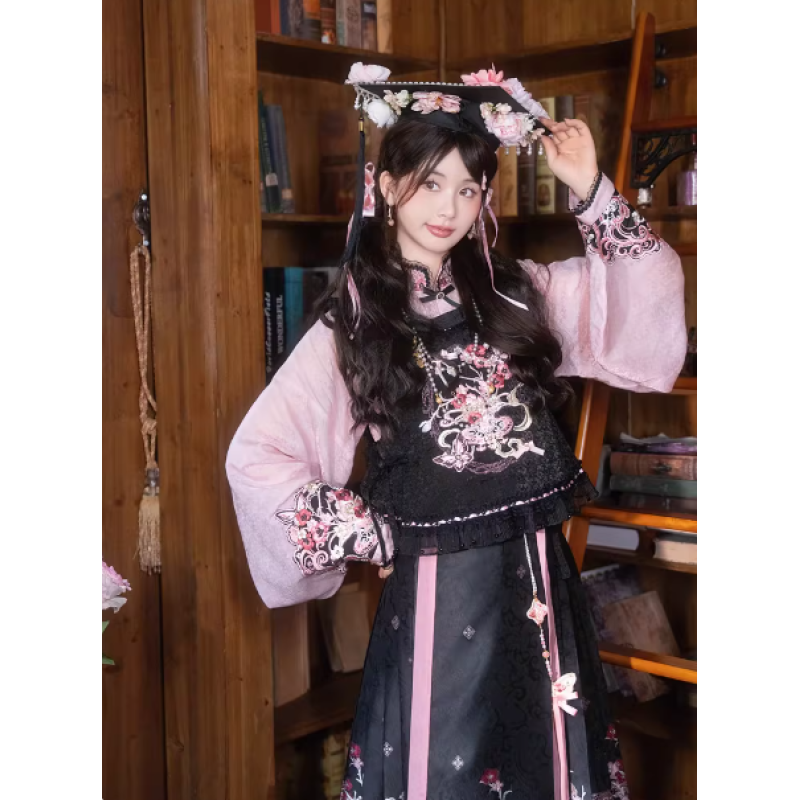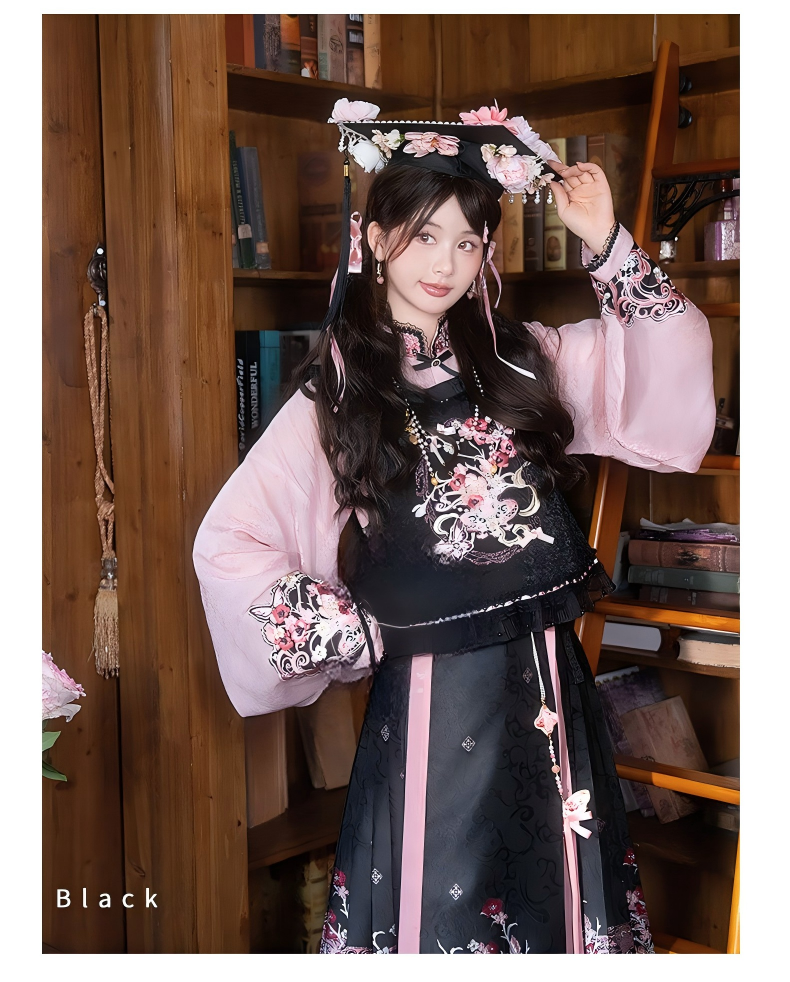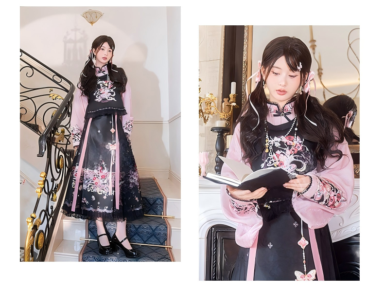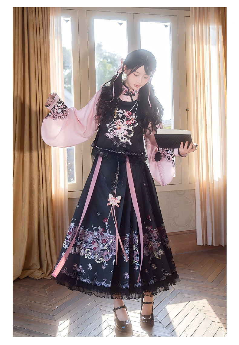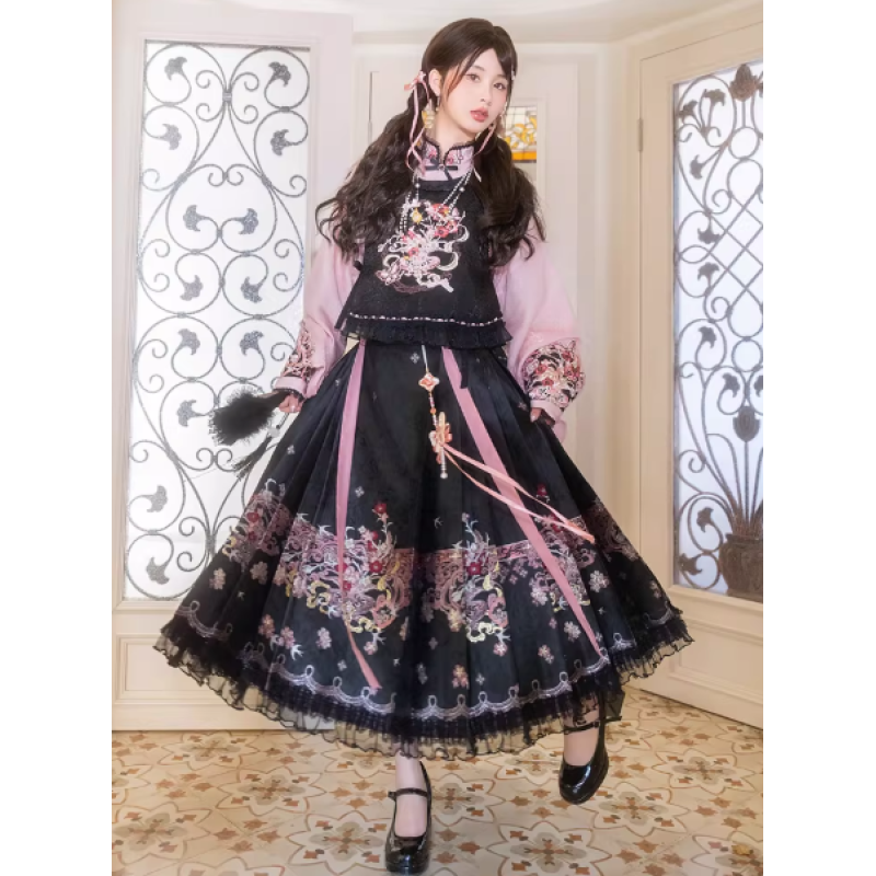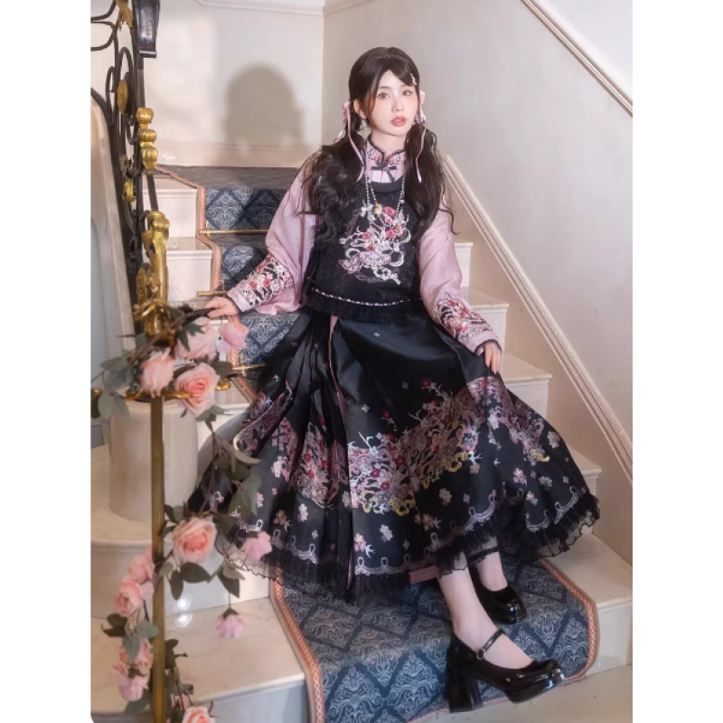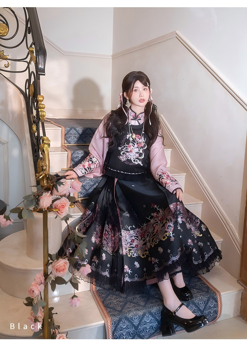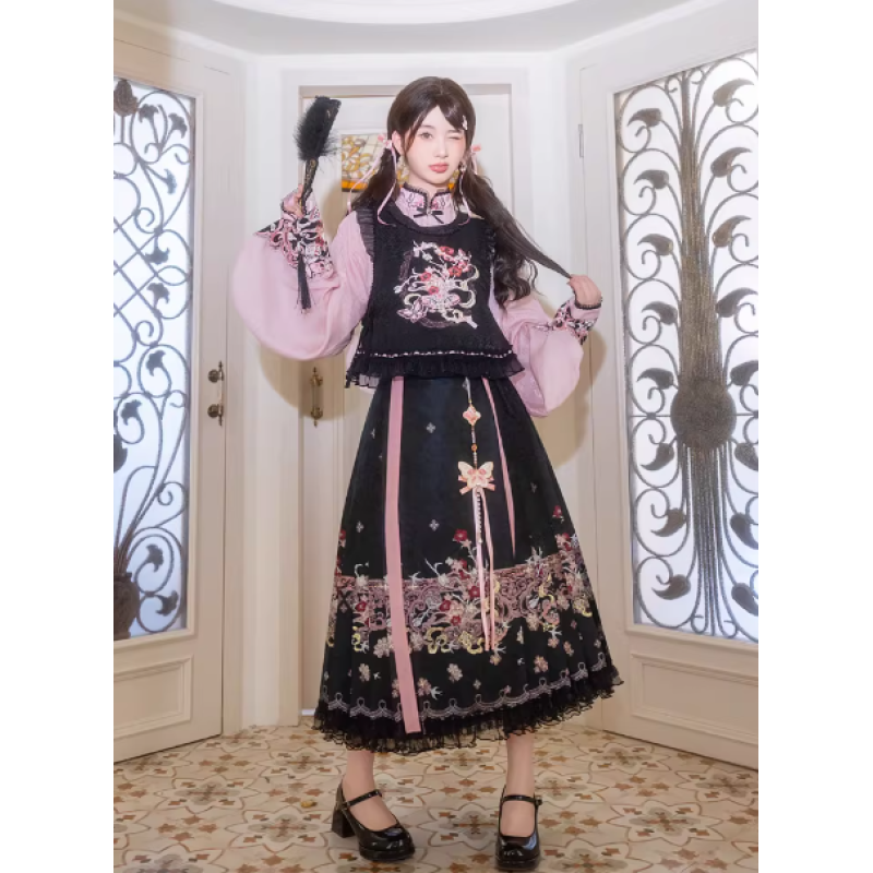 Improved Ankle-Length Mamian Skirt and Crew Neck Vest Set, Dark-Style Chinese Hanfu Women’s Outfit