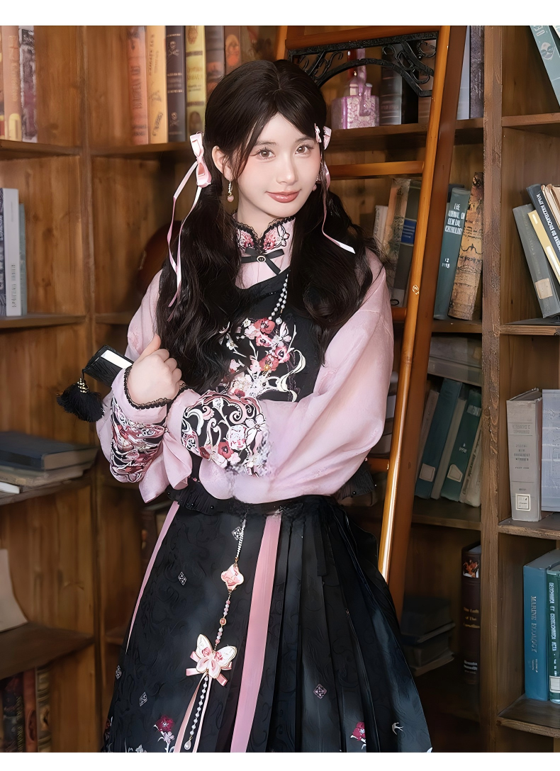 This upgraded dark-style Chinese Hanfu set combines the traditional Mamian skirt with a modern minimalist design, showcasing a refined Eastern aesthetic. The overall design features subtle textured fabrics and exquisite craftsmanship, offering an elegant yet understated look suitable for daily wear and photo styling.