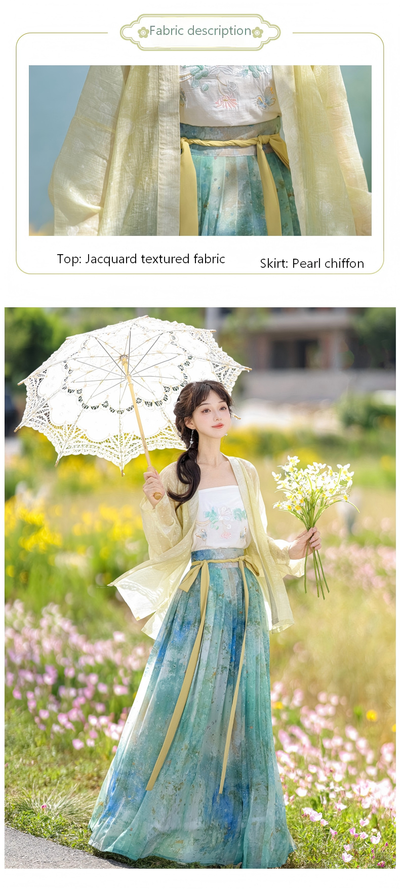 - Fabric: Jacquard textured top, pearl chiffon skirt