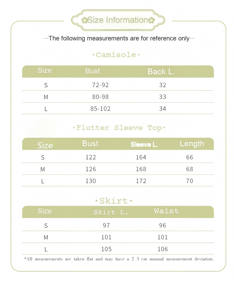 - Set Includes: Outer top + Camisole + Skirt (3-piece set)
