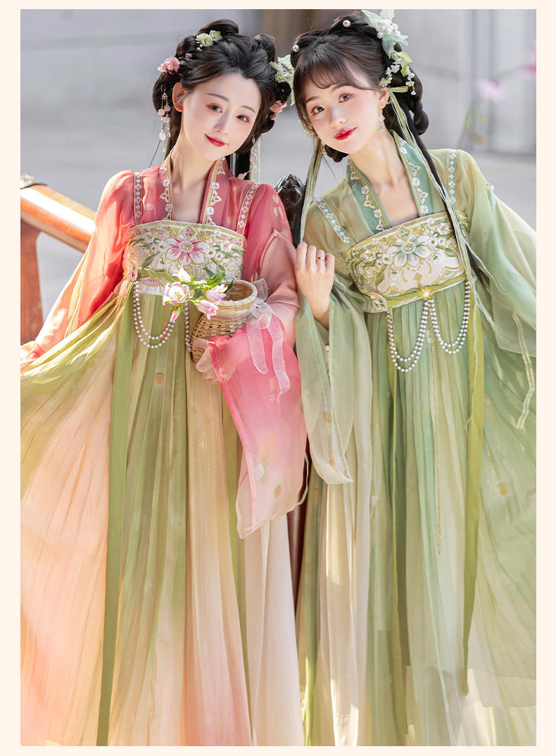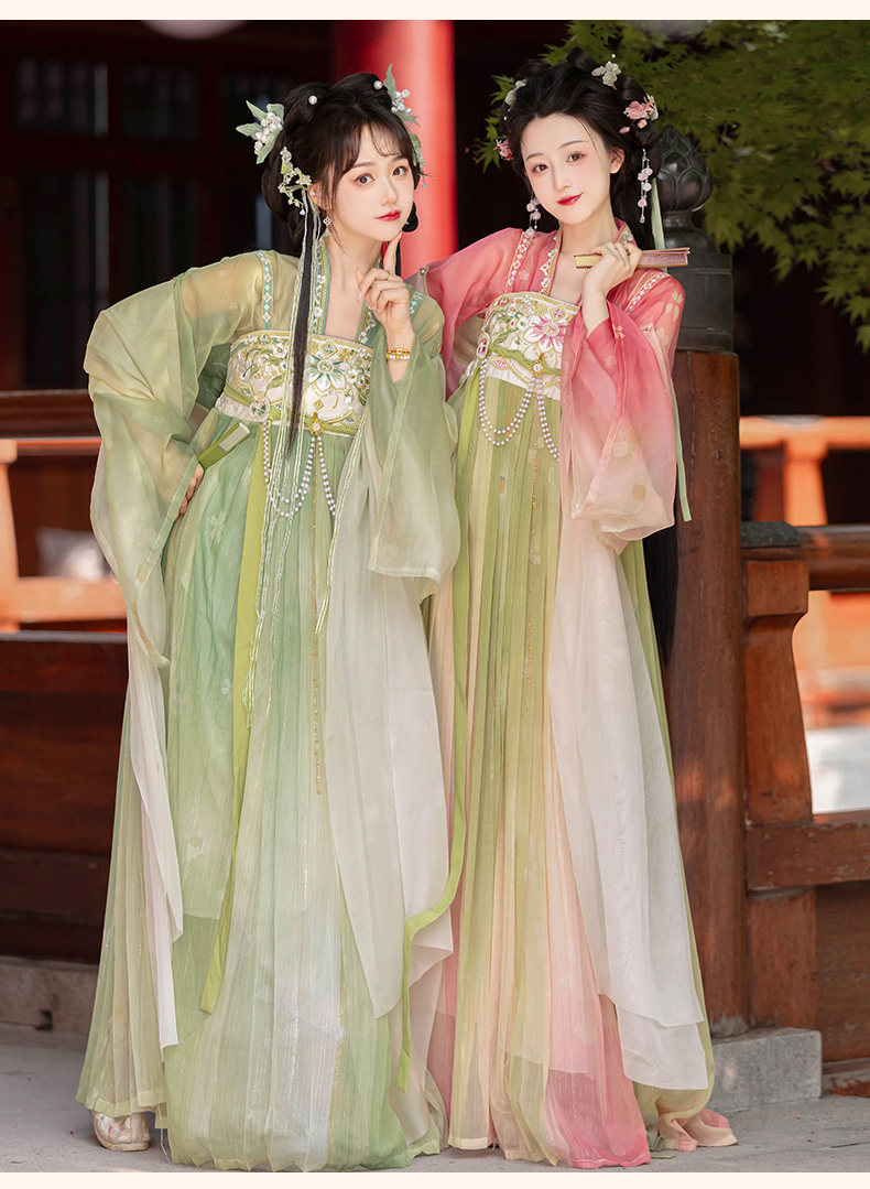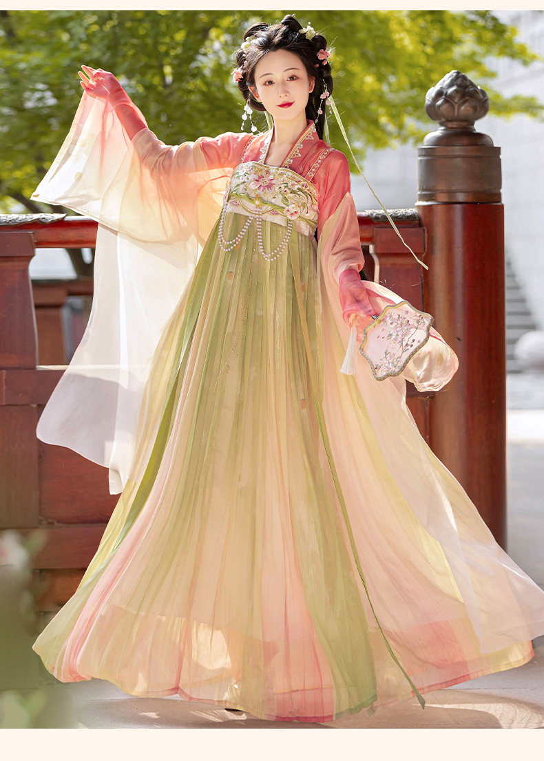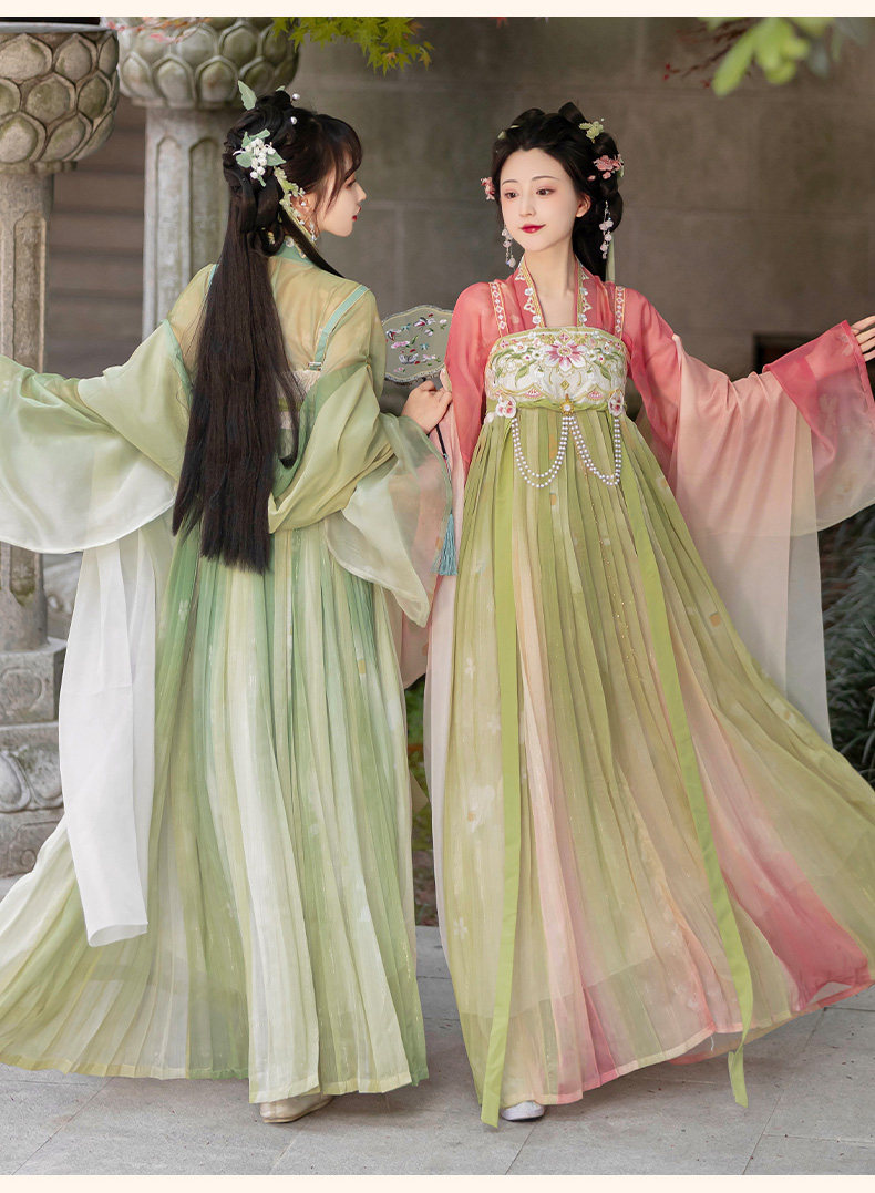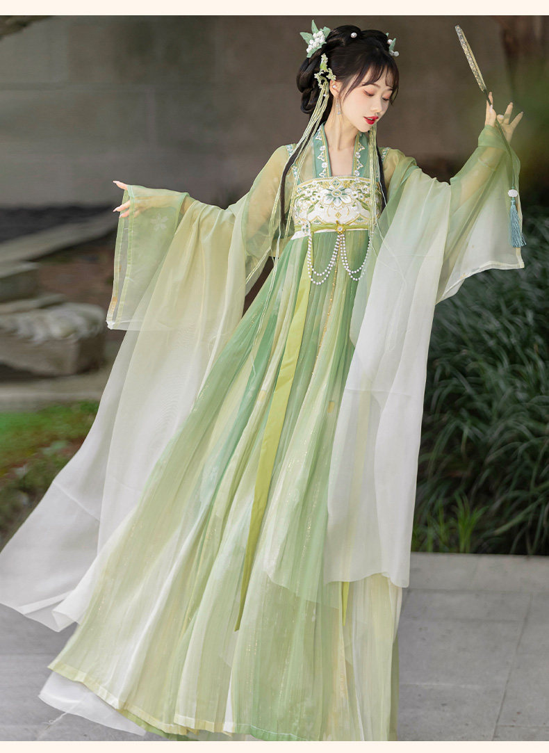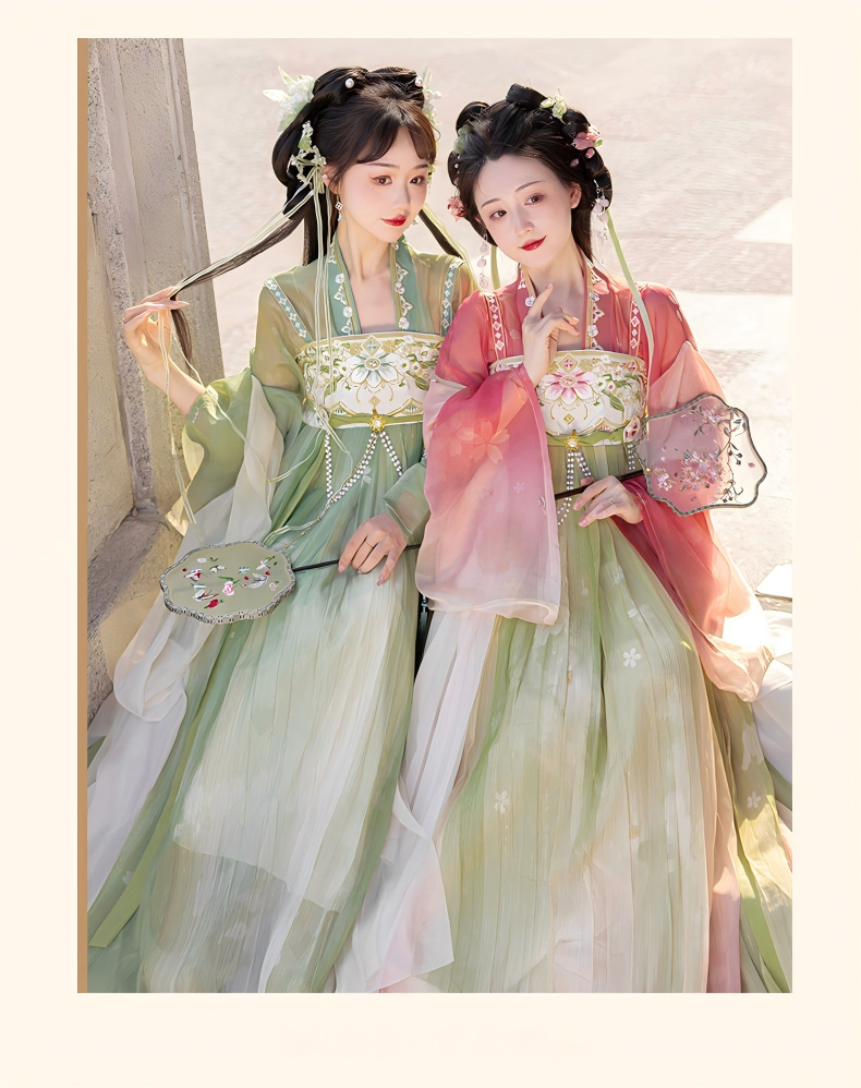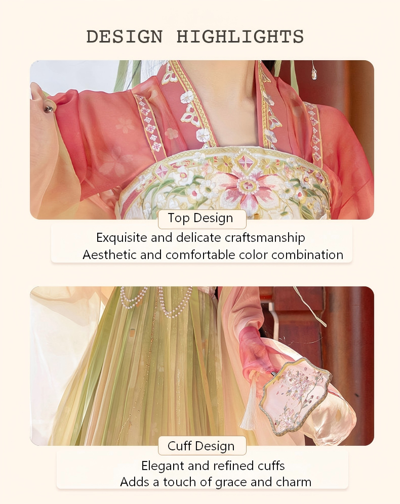 This Tang-style Hanfu-inspired outfit blends traditional elegance with modern aesthetics, showcasing a graceful and refined oriental charm. The set features a delicately embroidered front-opening short blouse with exquisite craftsmanship and a soft, harmonious color palette, offering both beauty and comfort. The finely designed cuffs add a touch of elegance and liveliness to the overall look.