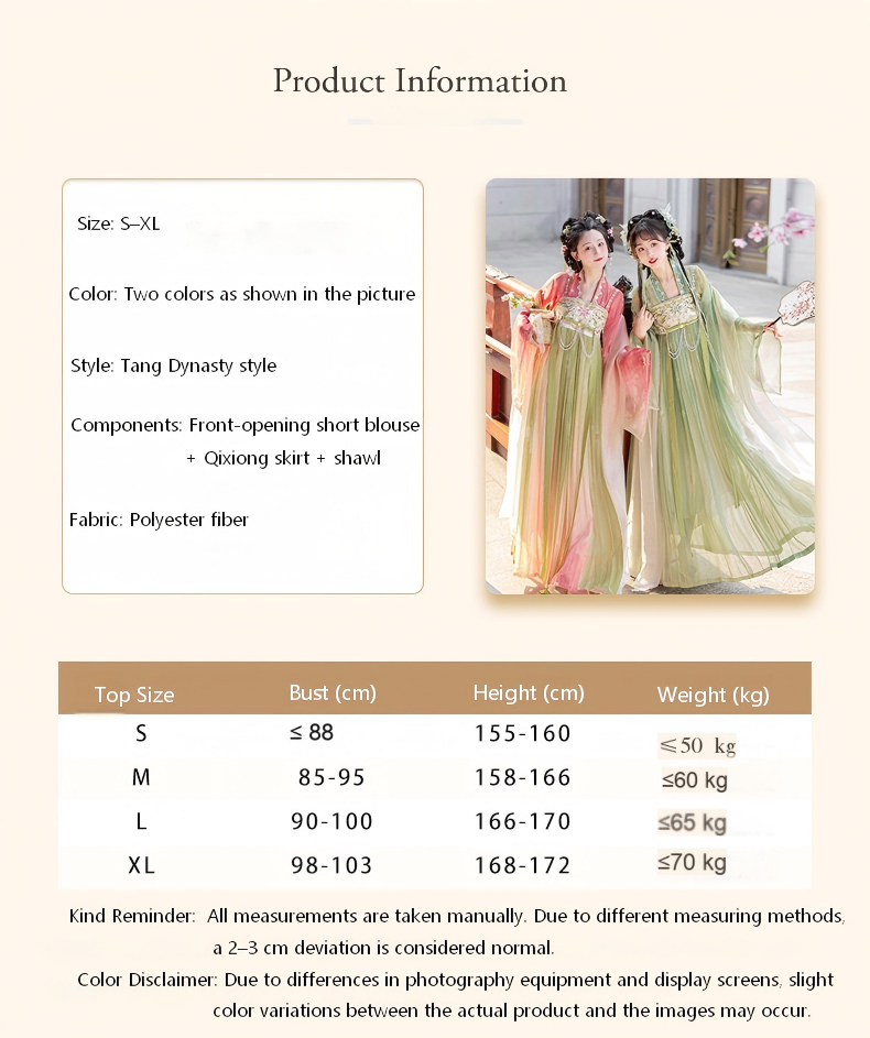 The Qixiong skirt is light and flowy, creating a soft and graceful silhouette with every movement. The full set includes a top, skirt, shawl, and waist chain, making it perfect for daily wear, photoshoots, or Hanfu enthusiasts.